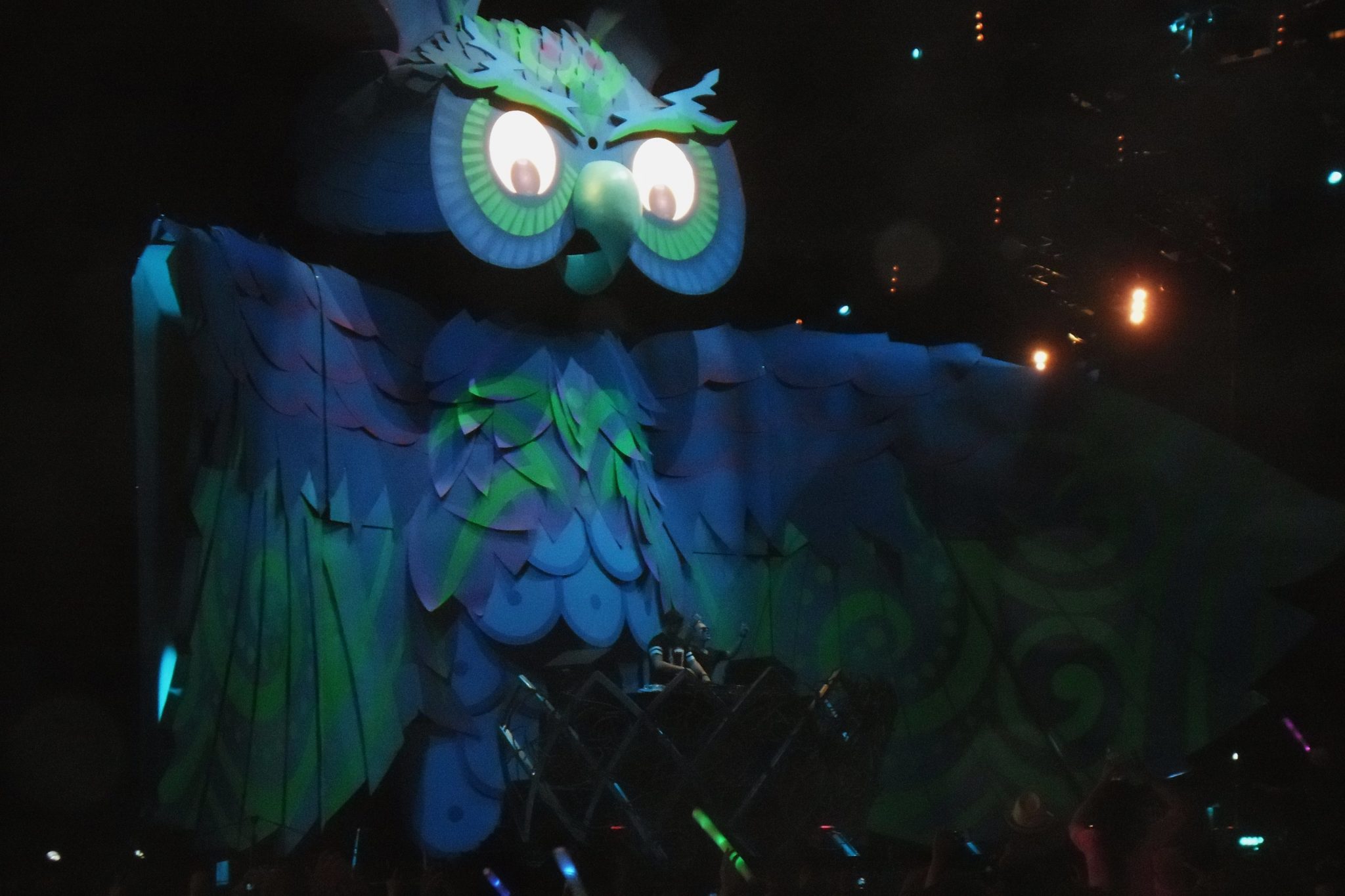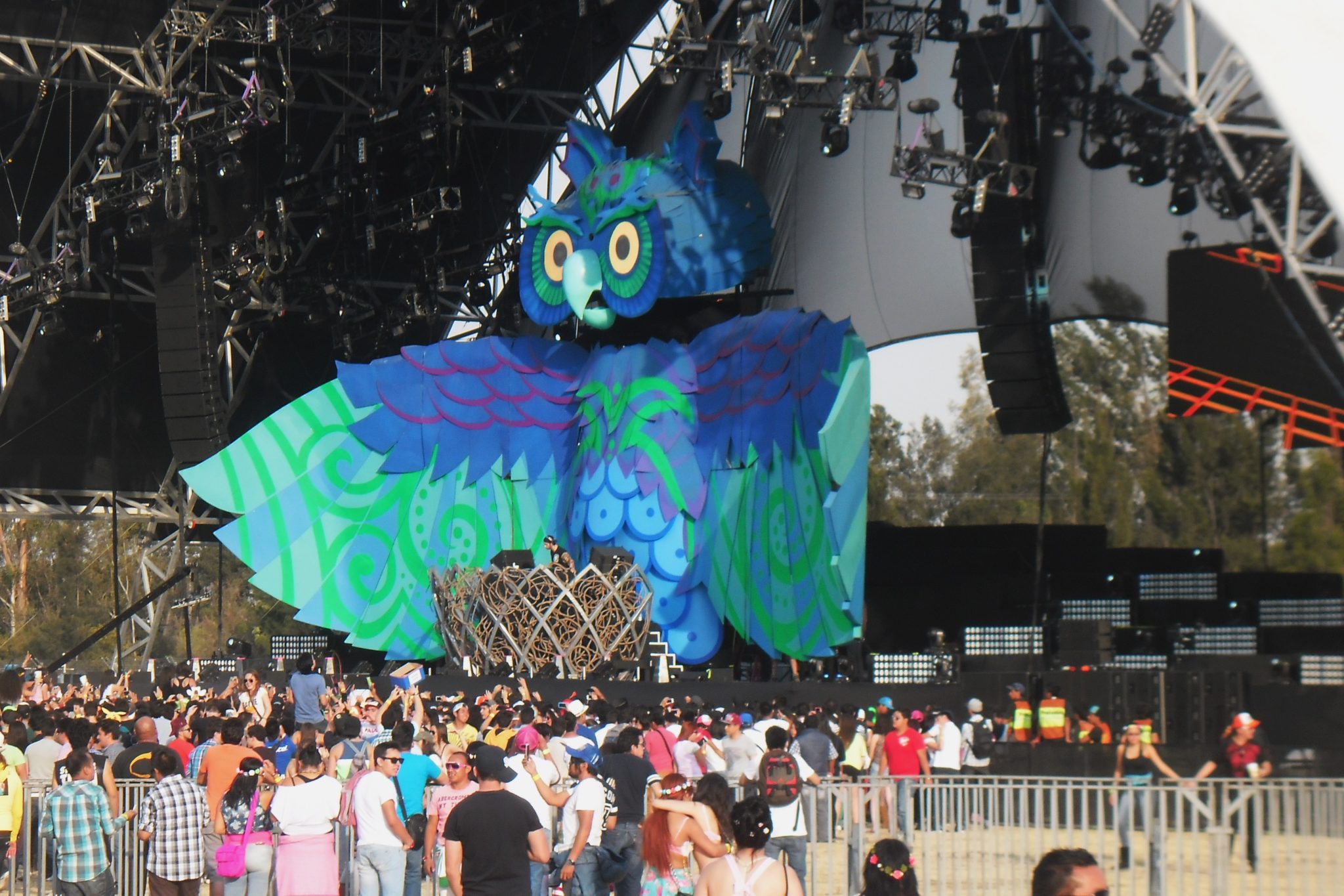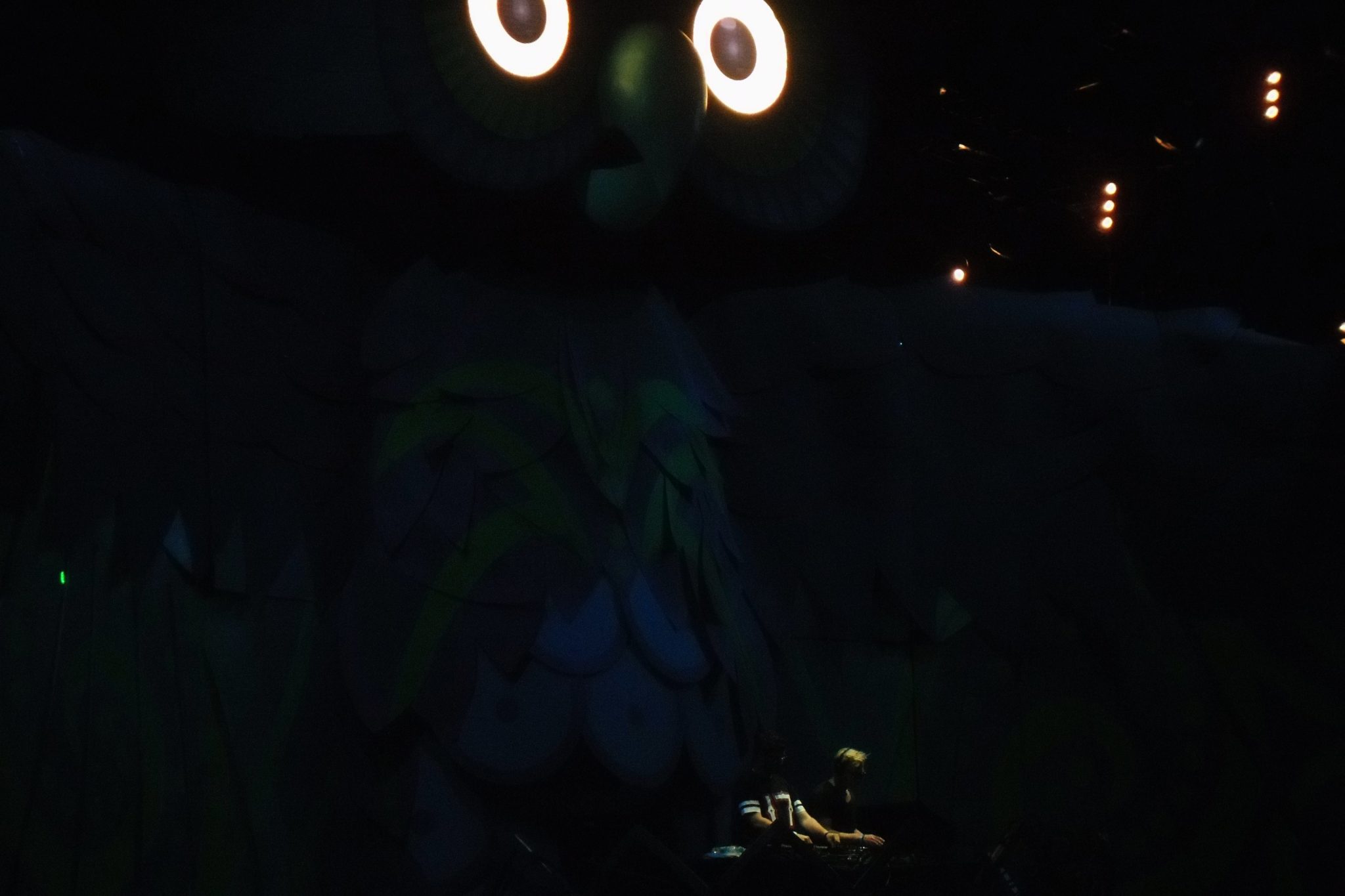 La noche caía pero el escenario principal, el KineticField nos mostraba su esplendoroso escenario de primer mundo donde el búho en cada cambio de Dj cerraba sus alas para que al comienzo de presentar a uno nuevo las abriera y engalanara el evento, también movía la cabeza a los lados y de arriba para abajo con el ritmo de la música, al mismo que sus ojos cambian para parecer molesto o mostrar un cambio en la imagen de ellos.